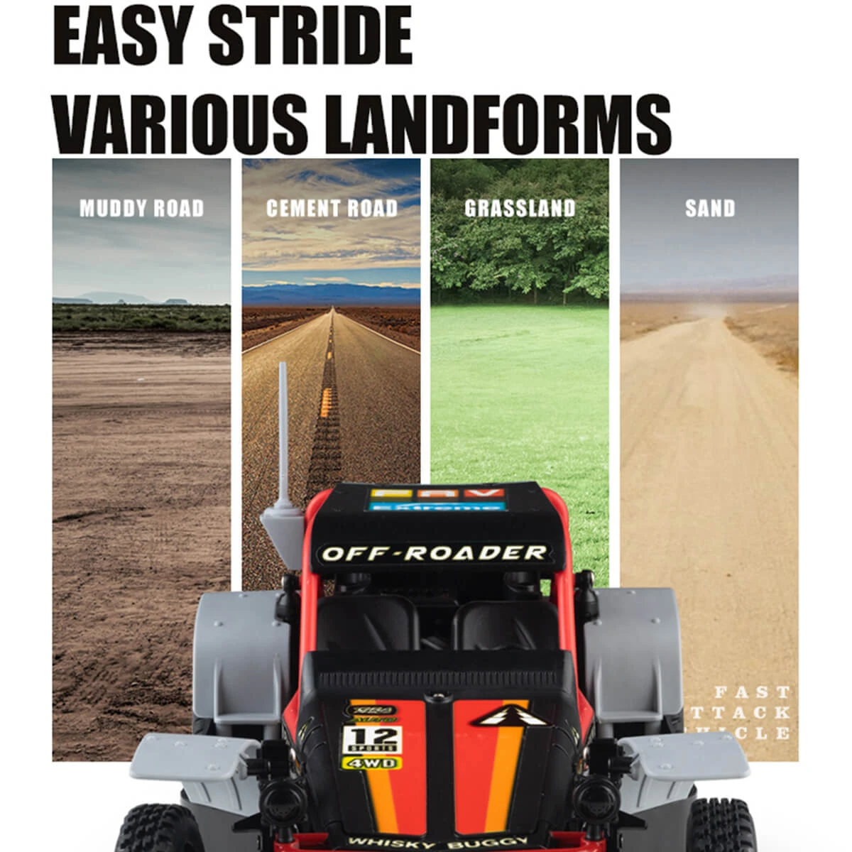 Multiple terrains: Muddy road, highway, grass field, sandy ground