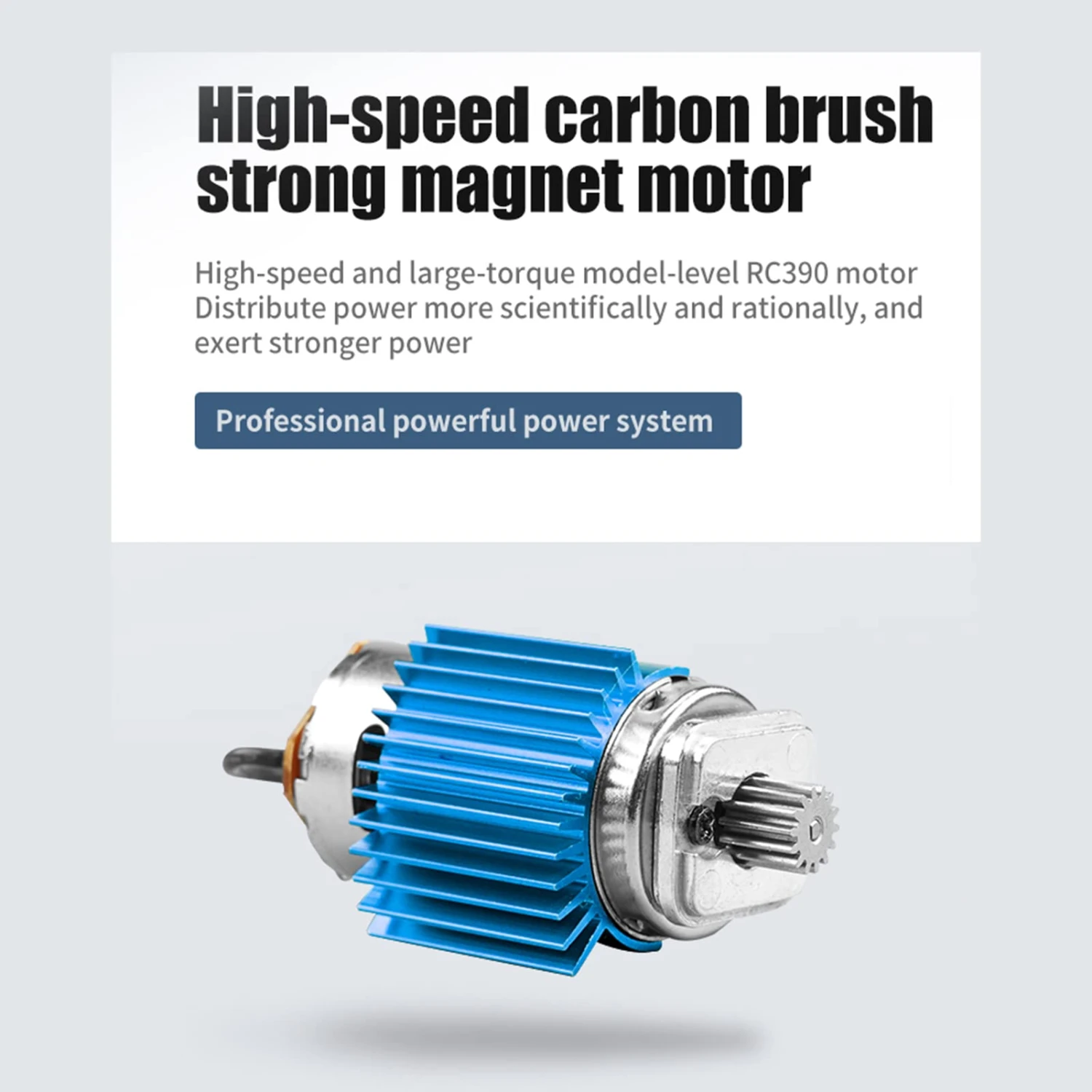 - Adopting simulation structure design, RC390 high-speed carbon brush strong magnetic motor, realizing full-proportional stepless speed change, high-speed driving, sudden acceleration, deceleration, braking, reversing, left turn, right turn.