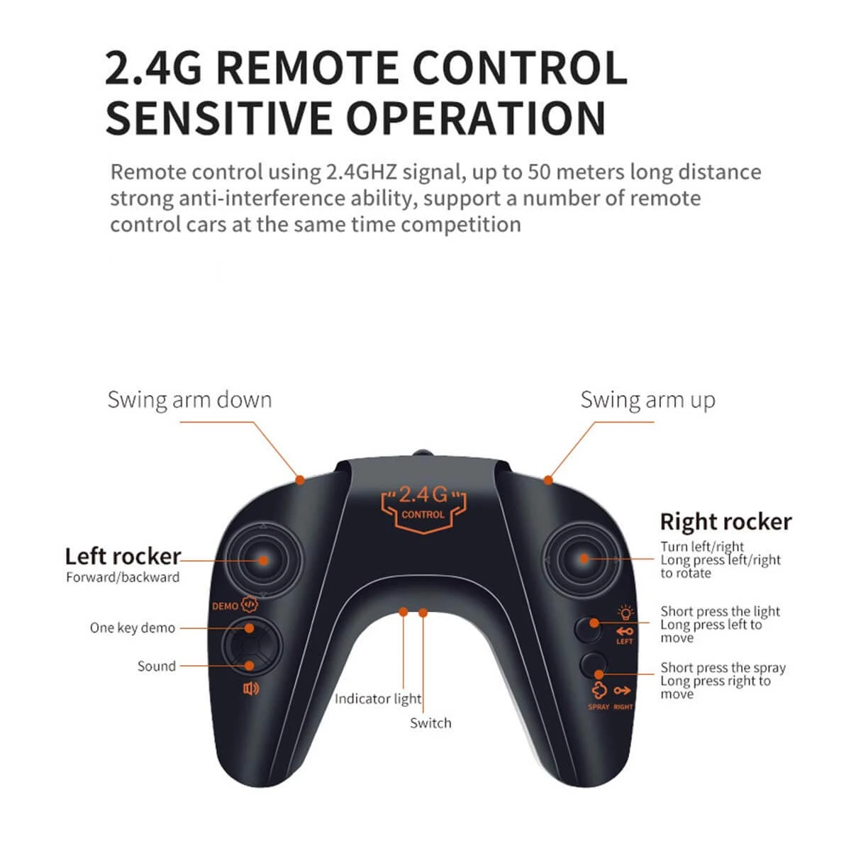 2.4G Remote Control: With 2.4Ghz signal, the operation is sensitive and the control distance can reach up to 164ft, support multi-vehicle competition at the same time.