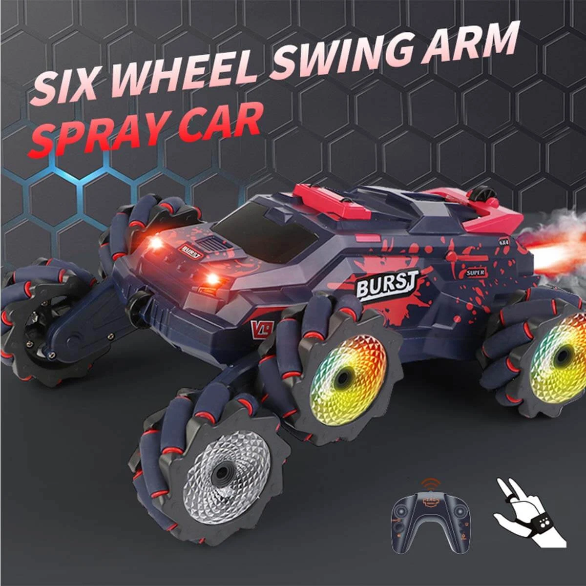 This 6-Wheel 2.4G RC Car offers a unique playing experience. Powerful swing arm design and many cool shapes, with cool lights and sprays, you will immediately become the focus of attention.