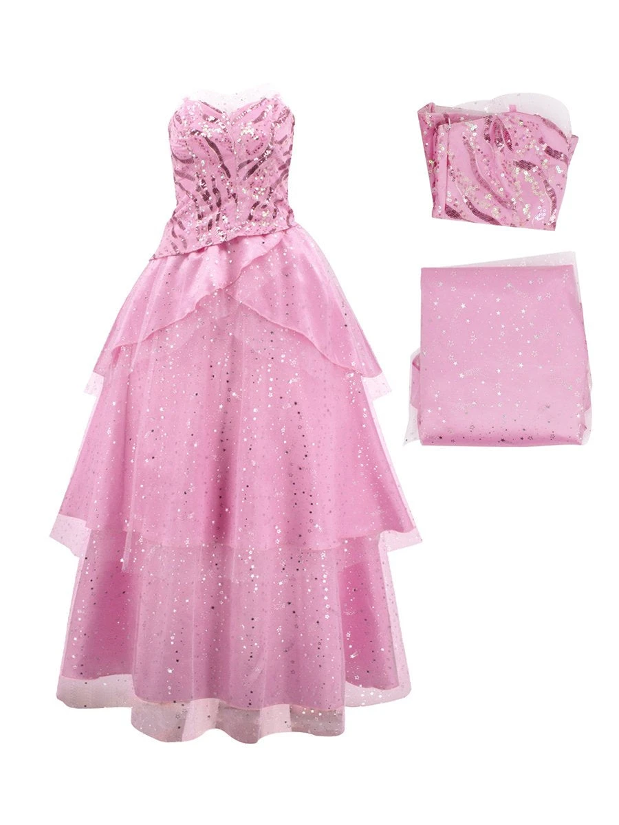 - Glinda dress includes 1x Glinda Mesh Dress, and 1x Sequins Top. Glinda costume full set includes 1x Glinda mesh dress, 1x Sequins top, and 1x Crown, 1x Wand, 1x Velvet cloak.