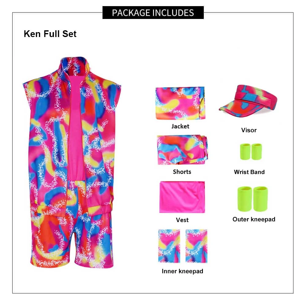 - Men [7PCS]: 1x colorful jacket, 1x pair of shorts, 1x hot pink vest, 1x pair of inner knee pads., 1x visor, 1x pair of outer knee pads and 1x pair of wrist band.