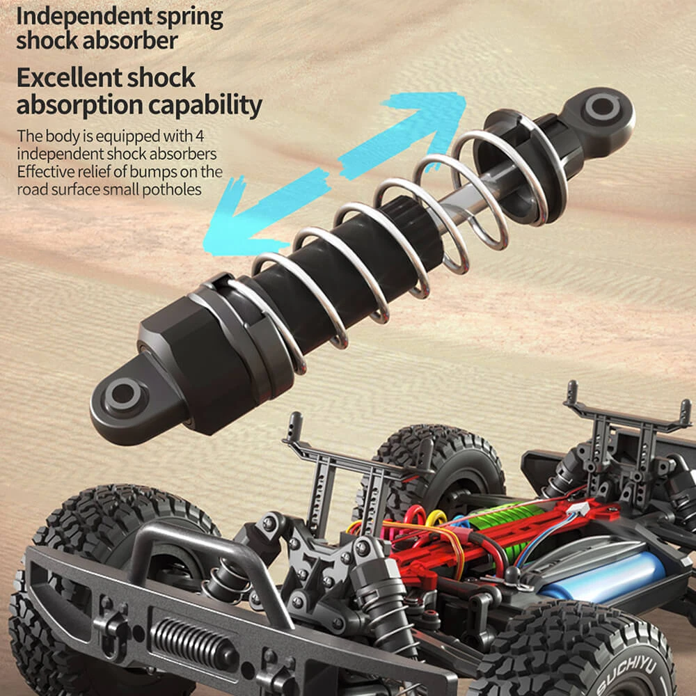 Independent Suspension System: The rc truck comes with four Independent spring shock absorption and off-road tires. Ultra-smooth shocks damp the suspension which allows you to drive the car on all terrains such as beaches, sandy beaches, rocks and concrete roads.