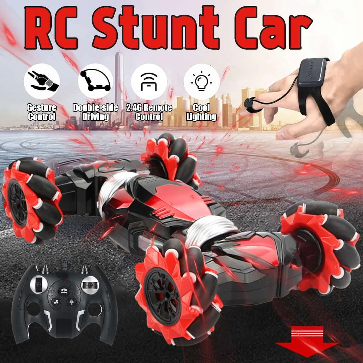 This Remote Stunt Car with 4 powerful wheels can do difficult climbing and flexible driving in all terrain. It can be controlled by sensor watch or remote controller, brings you to a new level of RC fun.