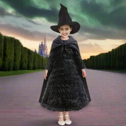Girls Elphaba Costume Black Wicked Dress and Cape for Dress Up Party.
