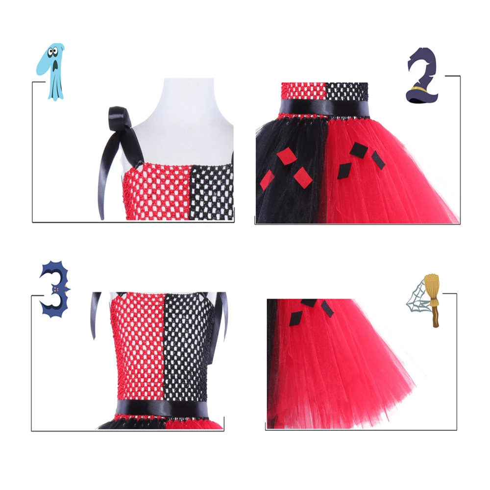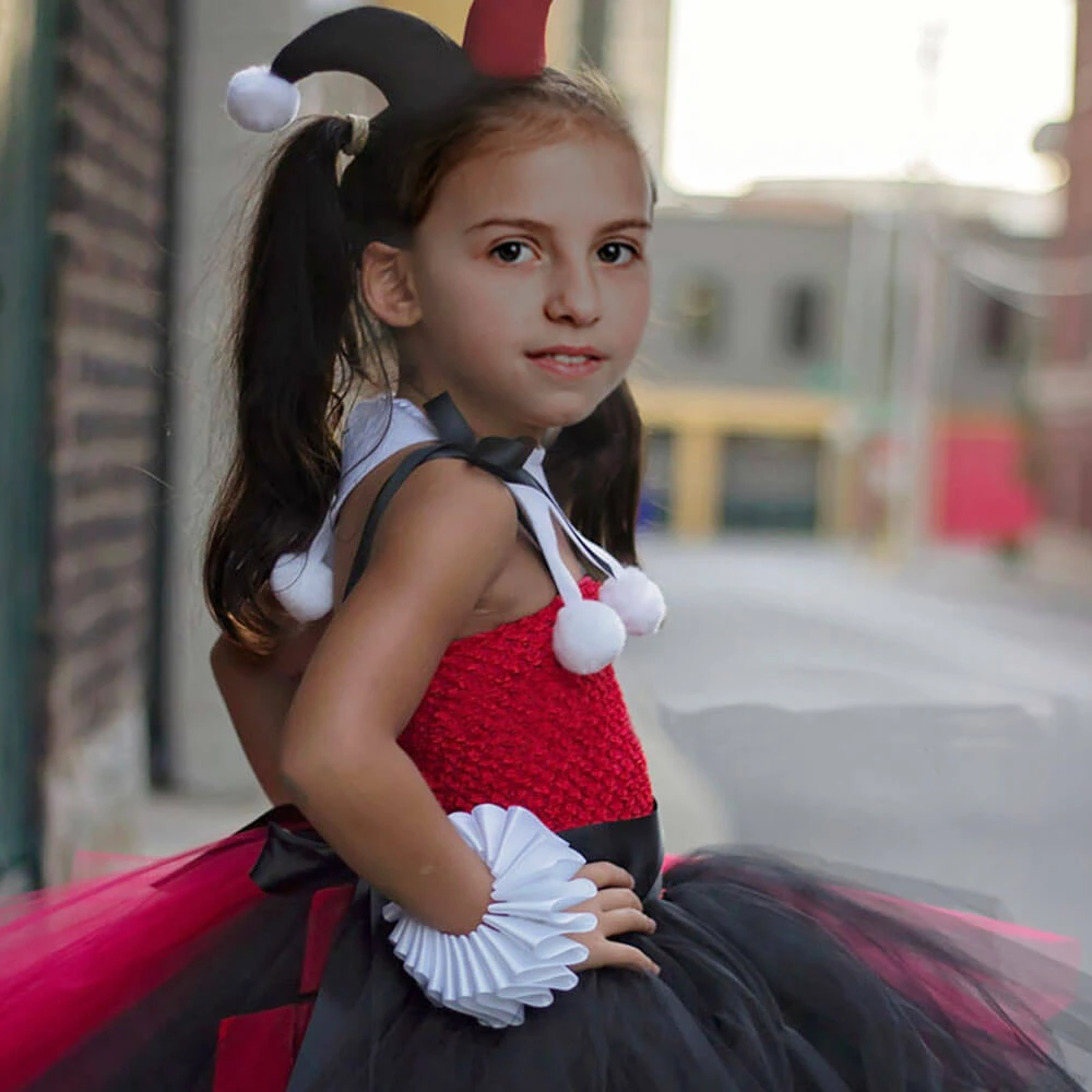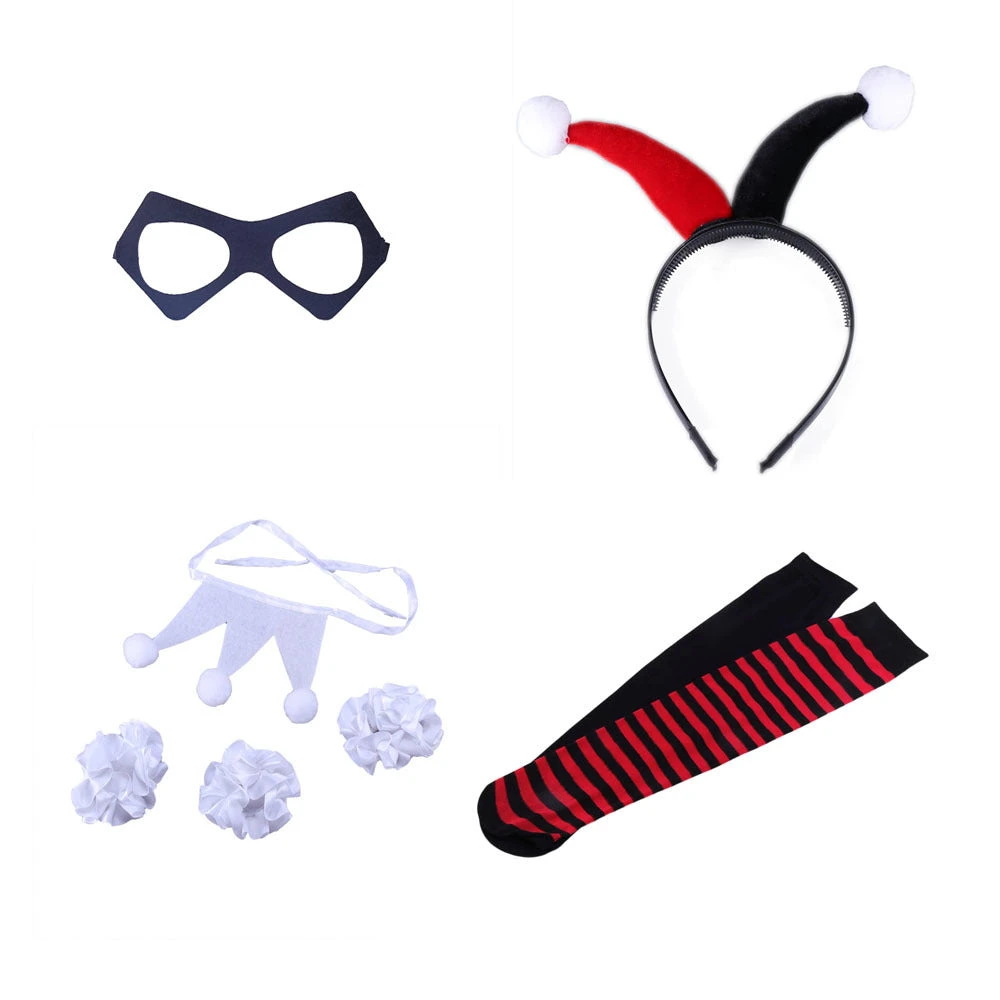- The wickedly cute sleeveless dress design inspired from Harley’s costume in movie. Add the ruffly white wrist warmers, the socks, the mask and the headband topped with black and red jester horns and you’re all set to cause mischief!
