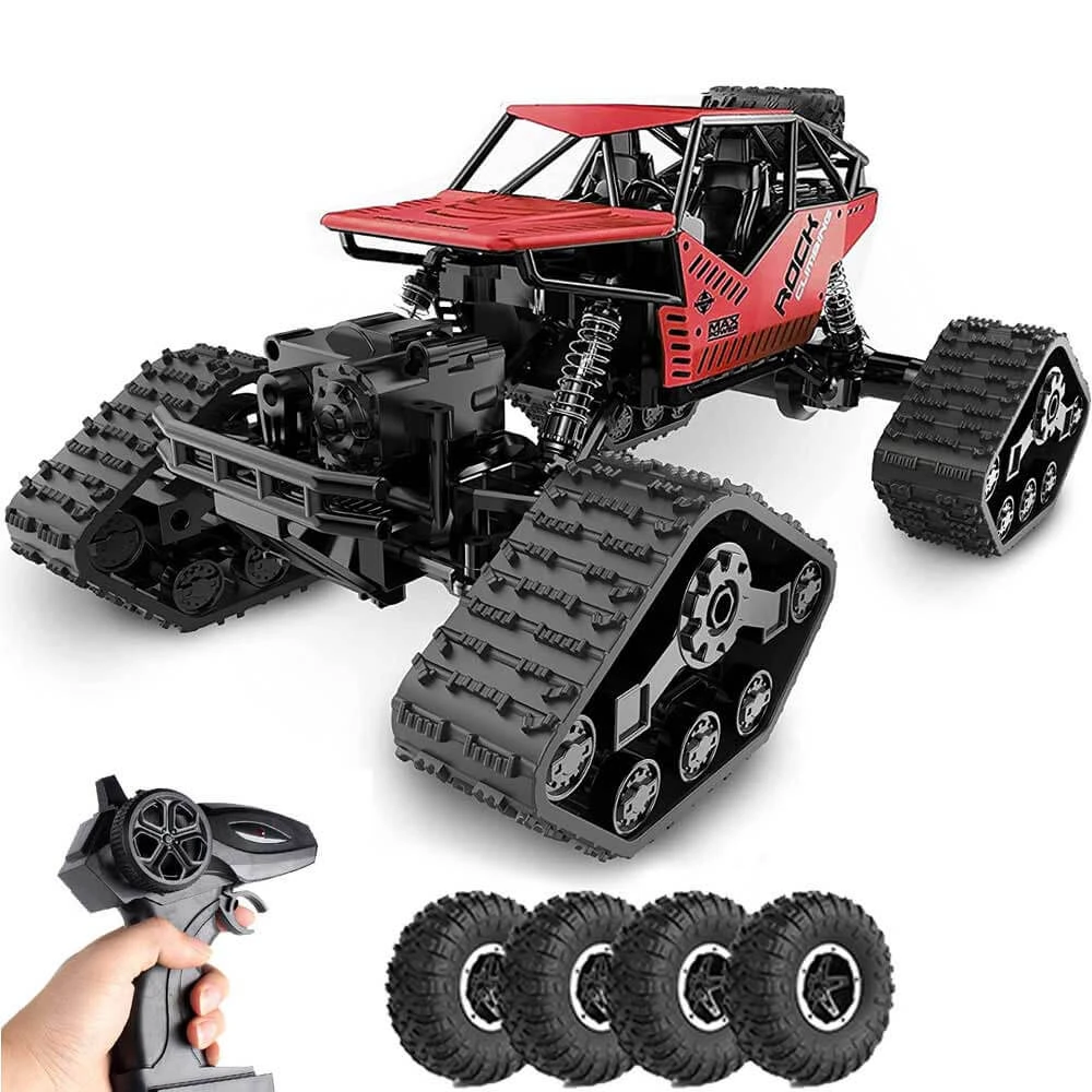 2 in 1 Climbing Off-Road Truck: Equipped with two types of tires, 4 of each, which allows to easily drive in a variety of terrains. One is Hi-Q rubber tires, with wear-resistant and great climbing ability. The other is the tank track wheel,with a stronger grip.