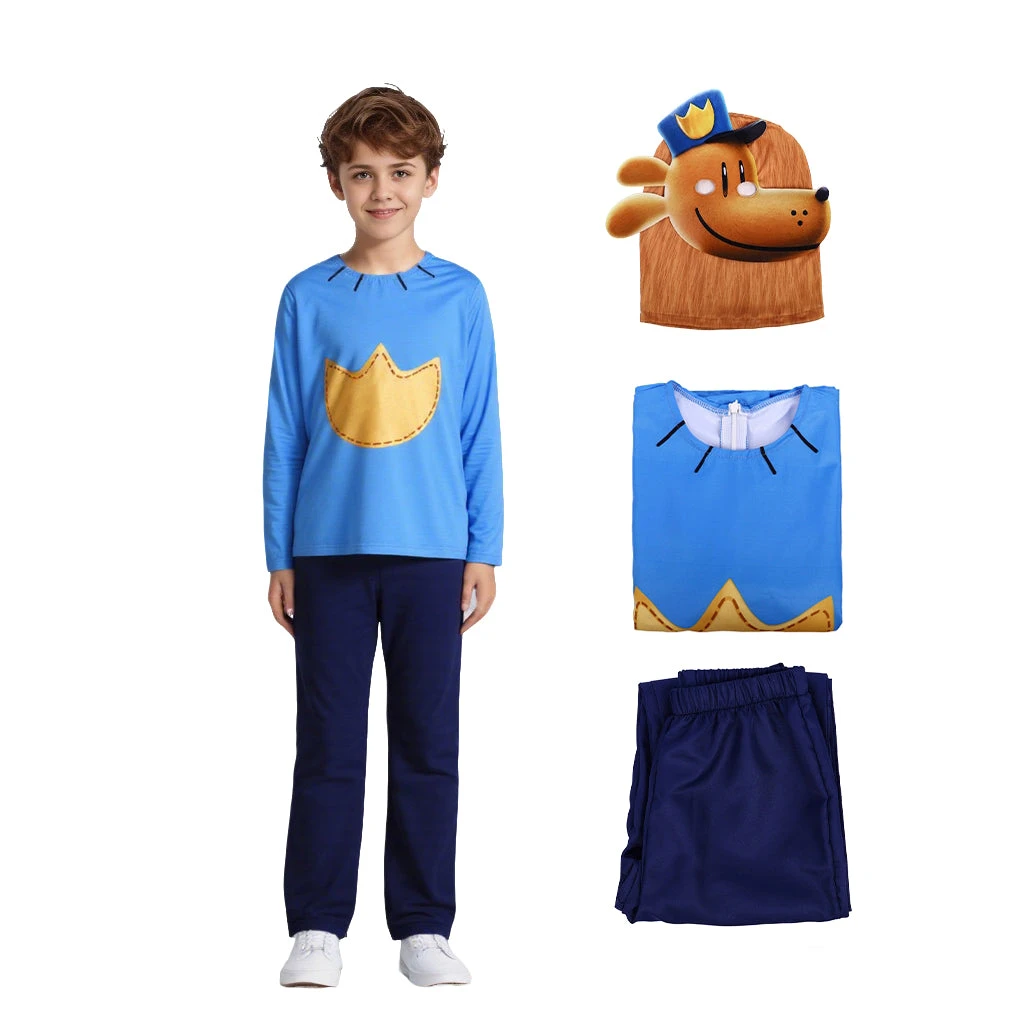- The outfit features iconic half-dog, and half-human. Blue top is accented with yellow paw-print signature, while the 3D police dog mask adds an extra touch.