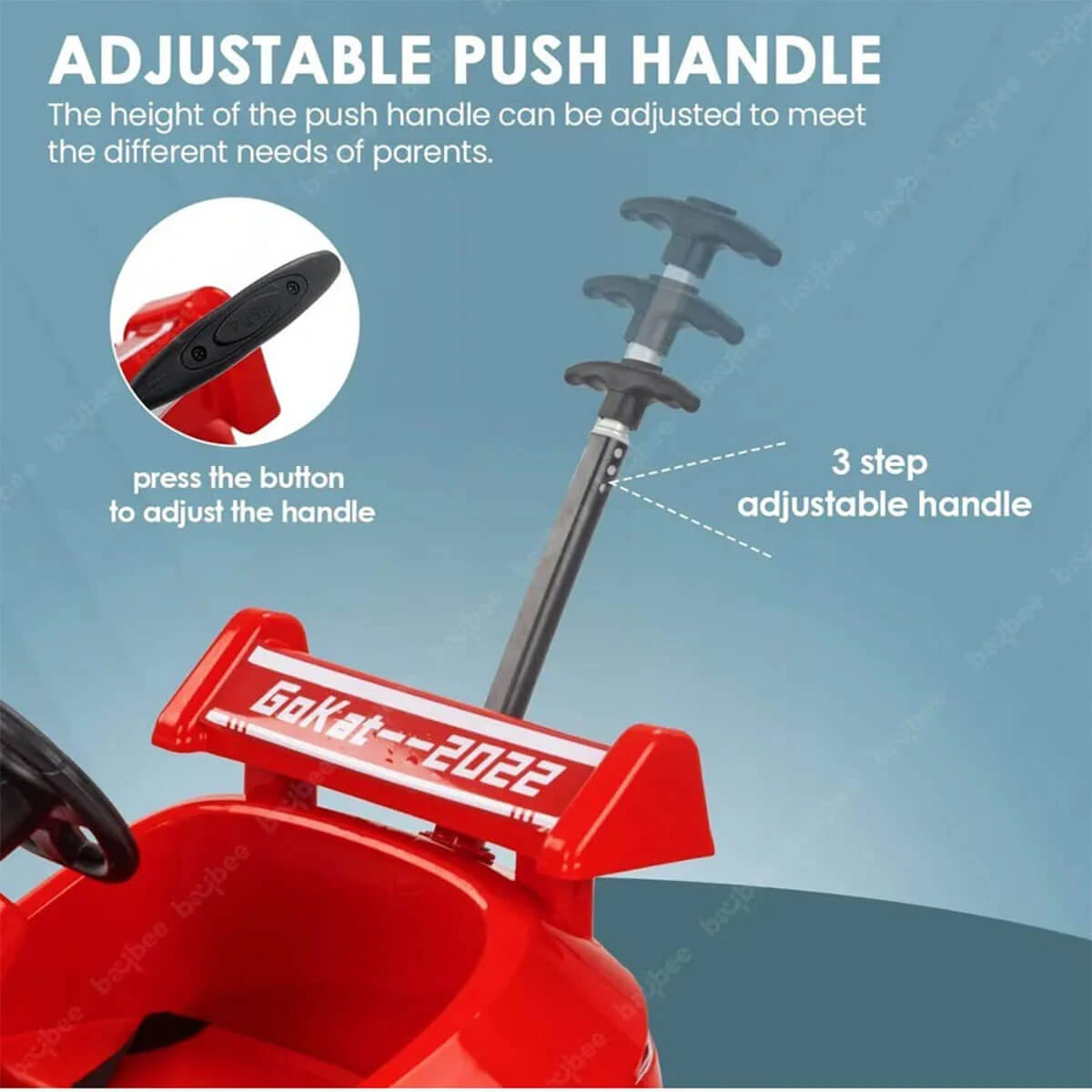 Adult-supervised: This go-kart comes with adjustable push bar, it can control the steering so that the parent is in control of the speed and direction which enables supervision of your baby at all times. It can also be used as a stroller, allowing your child use it at different stages.