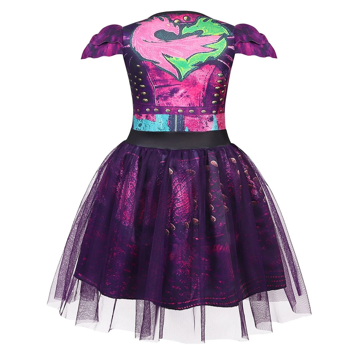 Kids Princess Mal Dress Queen Tulle Mesh Purple Costume with Wig for Party.