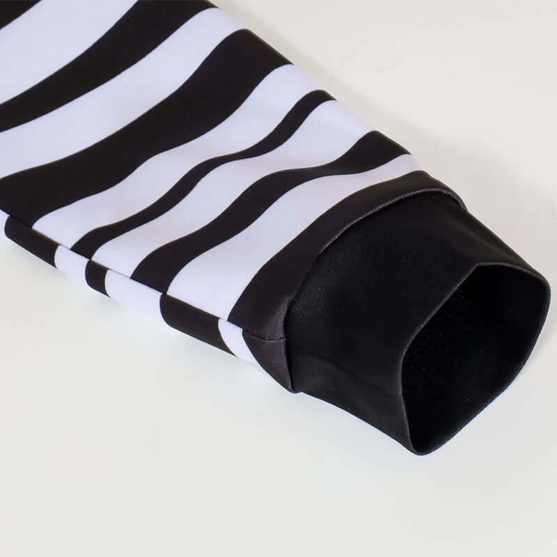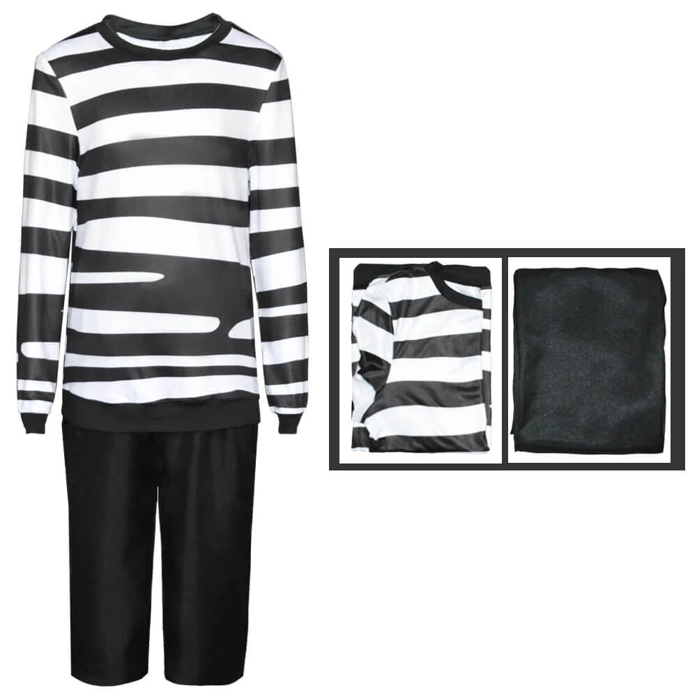 - The Pugsley costume with a loose style. It features a classic black and white striped long sleeve shirt, which would never out of date. The cropped trousers with elastic waist for a comfortable fit. Simple but pretty. It is the best gift for Pugsley Addams fans.Â
