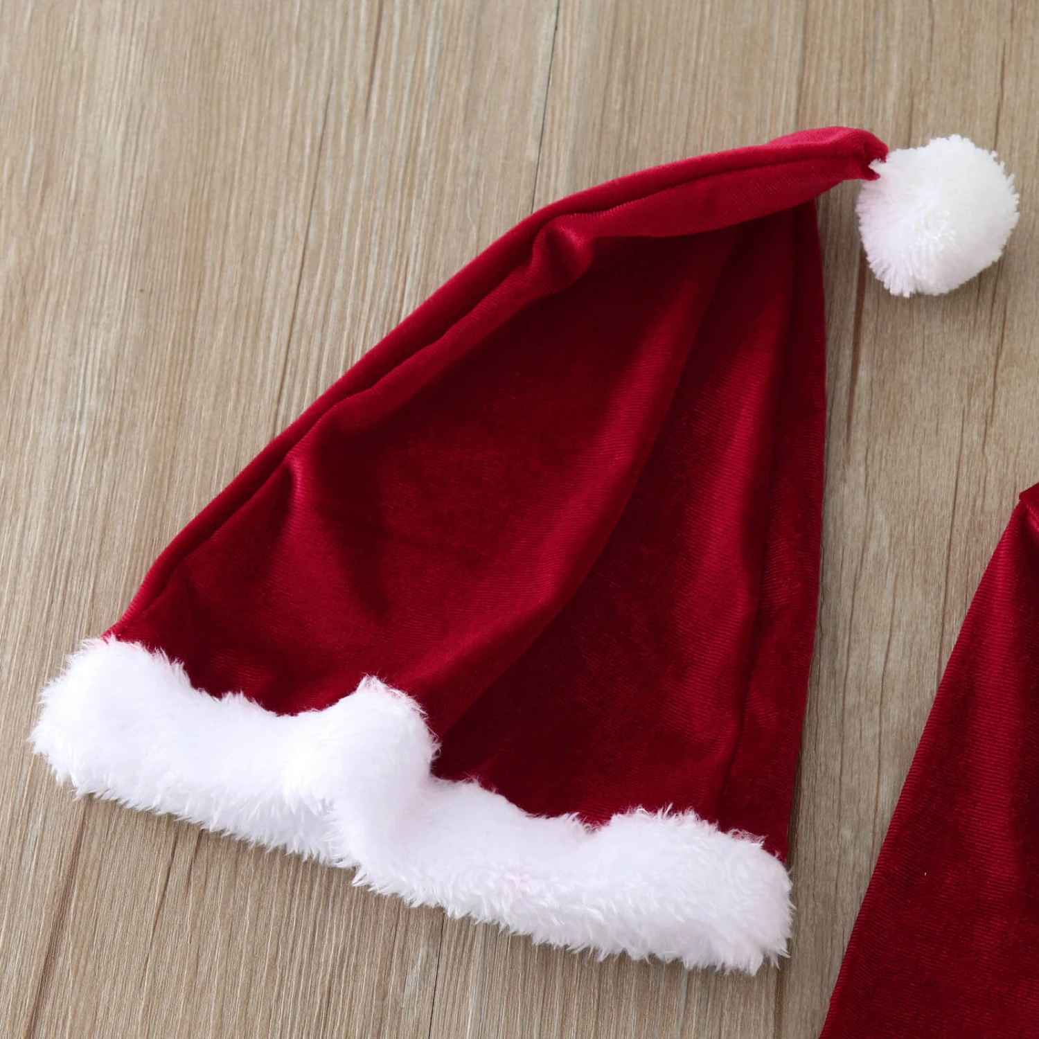 - Furry white collar and pants cuffs, very festive Christmas red, matching with Santa hat. Long sleeve tops, bell bottom, with a black belt. Put it on and spread some Holiday cheer in this cute costume!Â