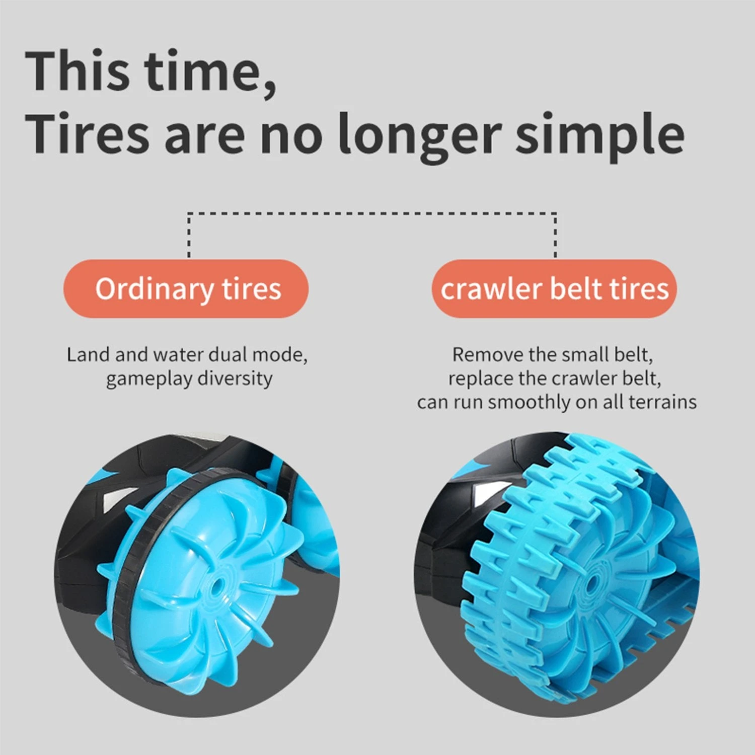 - Upgrade Off-road tracks make it break through land, sandy beach, mud, grass or sea easily. Take off the tracks and fit the small belt, then enjoy the swimming.