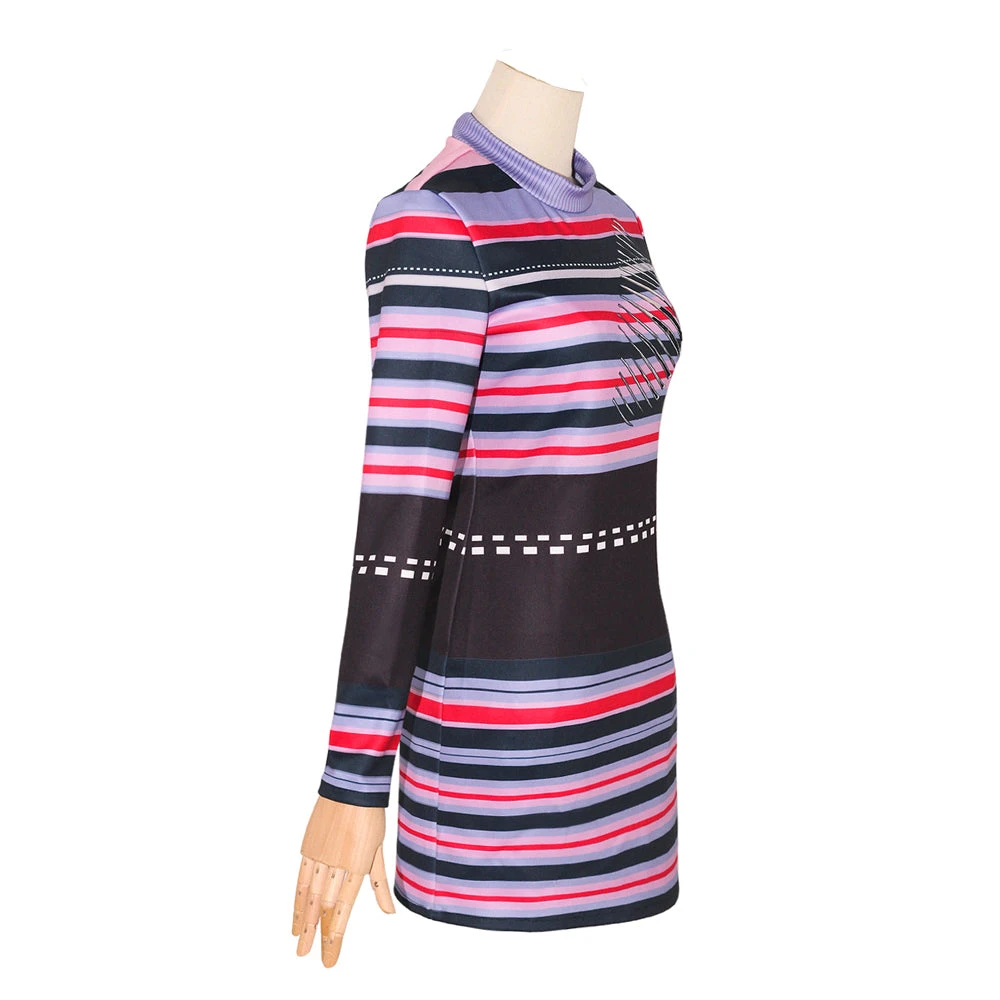 Women’s Astrid Deetz Costume Striped Purple Dress for Halloween Cosplay.